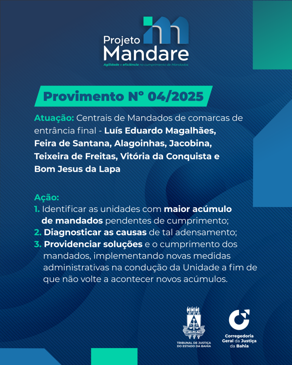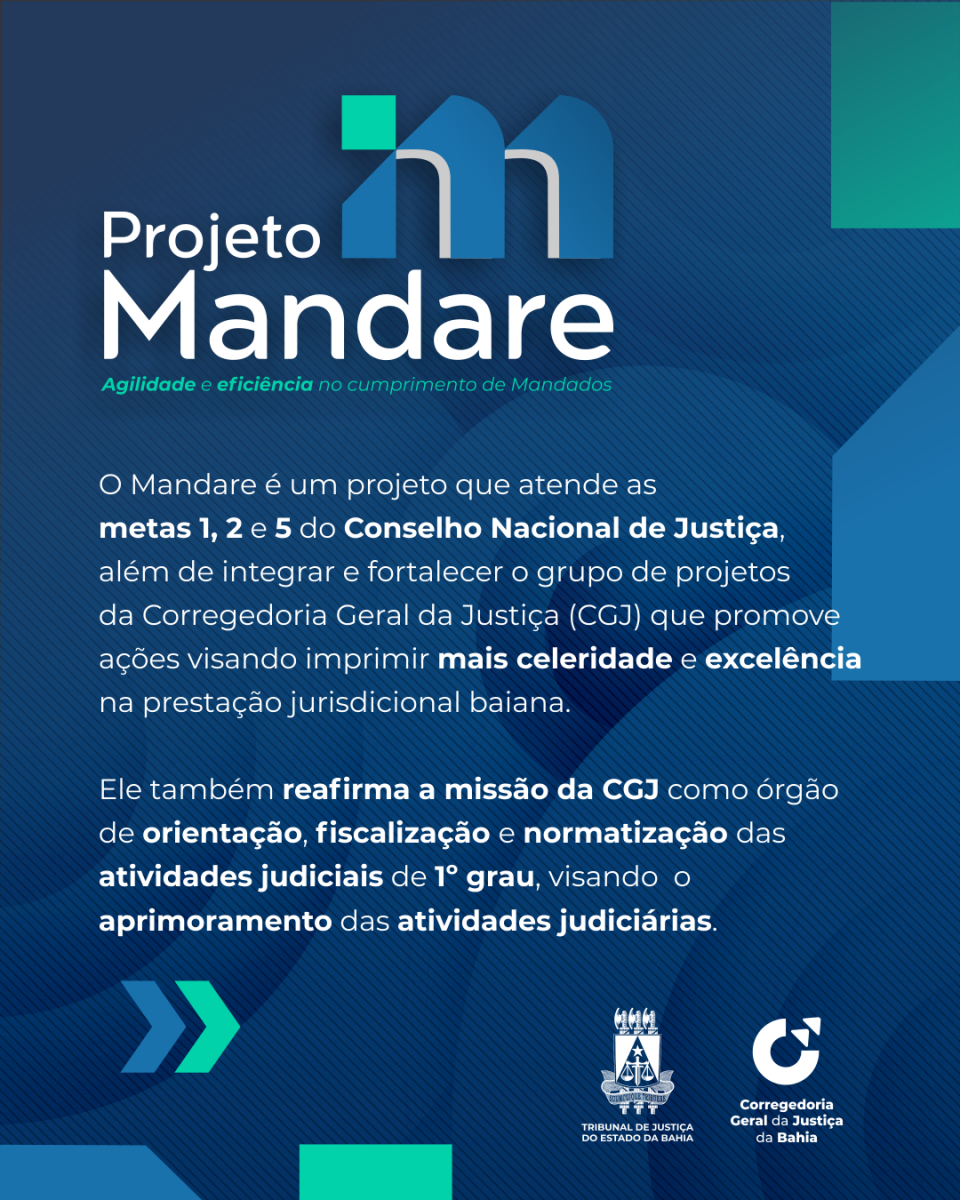 O projeto Mandare, da Corregedoria Geral da Justiça (CGJ), foi instituído através do Provimento Nº CGJ 04/2025, com a meta de atuar em sete Centrais de Mandados de comarcas de entrância final da Bahia, que passarão por reorganização operacional e funcional, conforme diagnóstico realizado para cada uma, são elas: Jacobina, Luís Eduardo Magalhães, Feira de Santana, Alagoinhas, Teixeira de Freitas, Vitória da Conquista e Bom Jesus da Lapa.