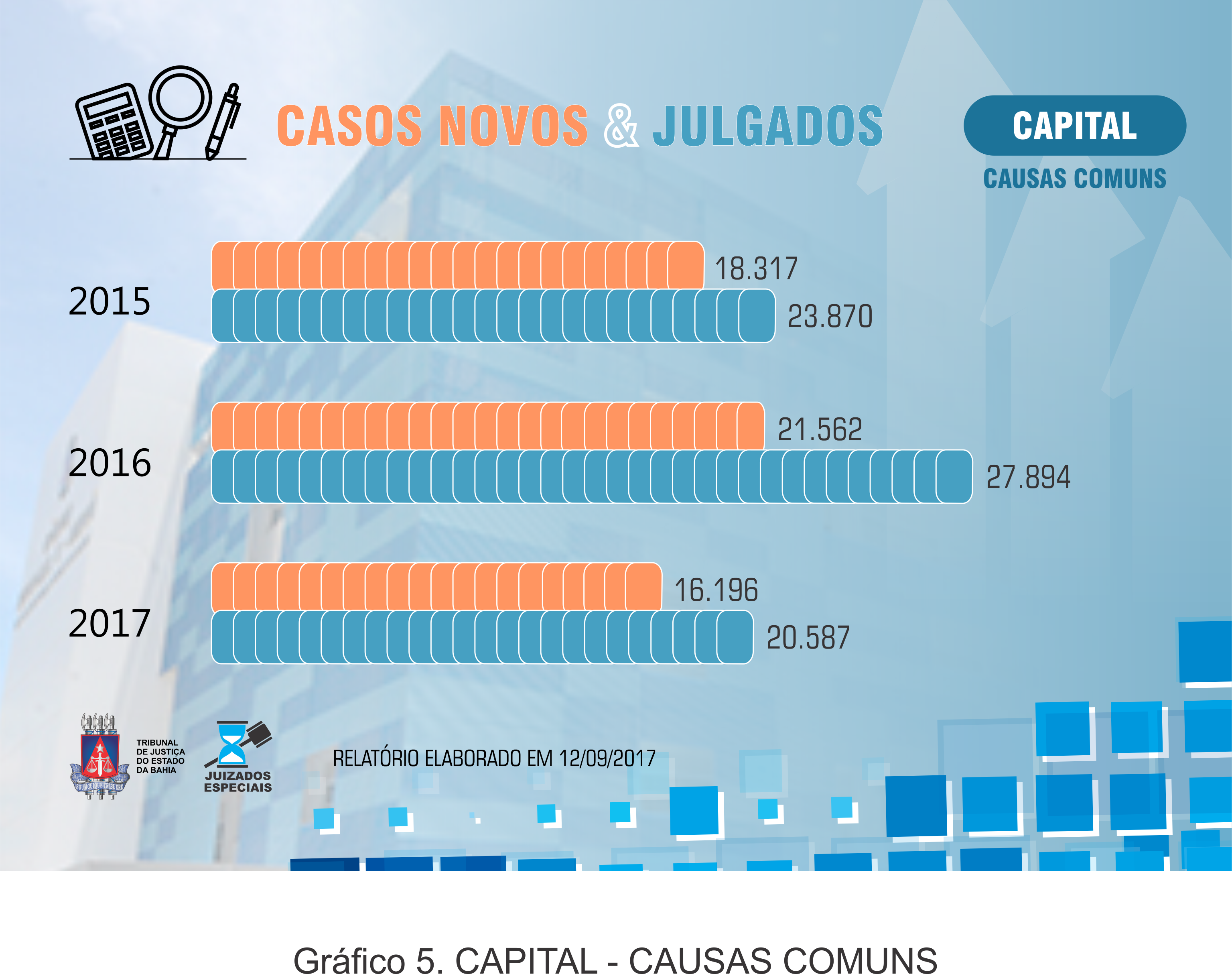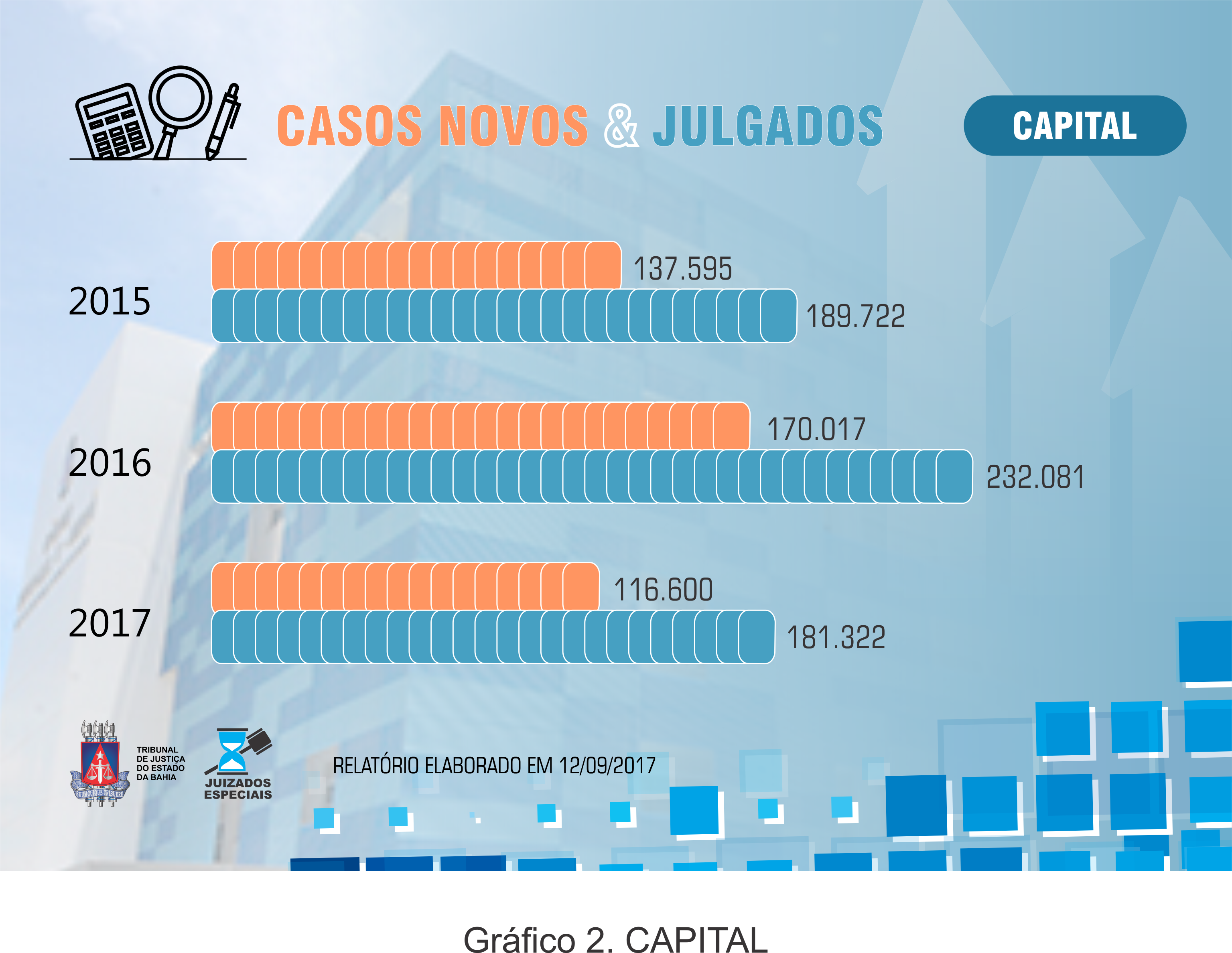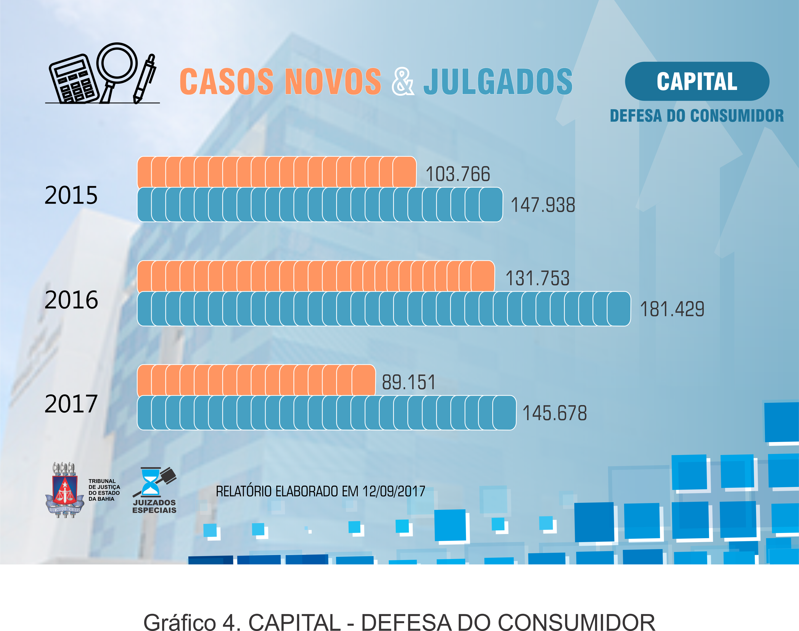Abaixo os dados referentes ao Sistema dos Juizados Especiais, CASOS NOVOS & JULGADOS, anos de 2015, 2016 e 2017 (até a data 11 de setembro de 2017).