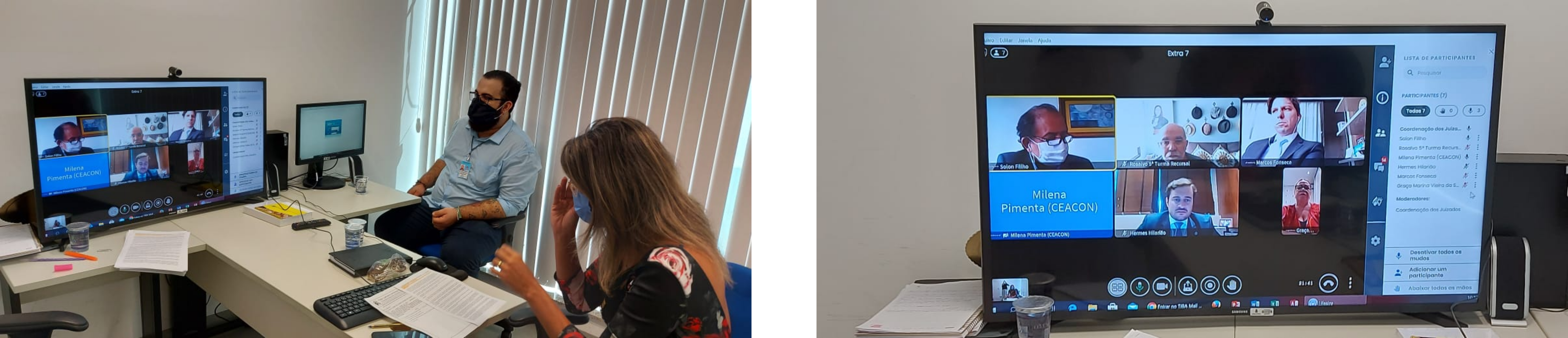 Participaram da reunião, por videoconferência, a Coordenadora dos Juizados Especiais da Bahia, a Juíza Fabiana Pellegrino, a Representante das unidades monocráticas dos Juizados Especiais, a Juíza Graça Marina Vieira da Silva, o Representante da Ordem dos Advogados do Brasil, Seção Bahia, Dr. Hermes Hilarião Teixeira Neto, o Representante das Turmas Recusais do Estado da Bahia, o Juíz Rosalvo Augusto Vieira da Silva, o Representante da Defensoria Pública do Estado da Bahia, Dr. Marcos Fonseca Meireles, além do Representante do Ministério Público do Estado da Bahia, Dr. Solon Dias da Rocha Filho.