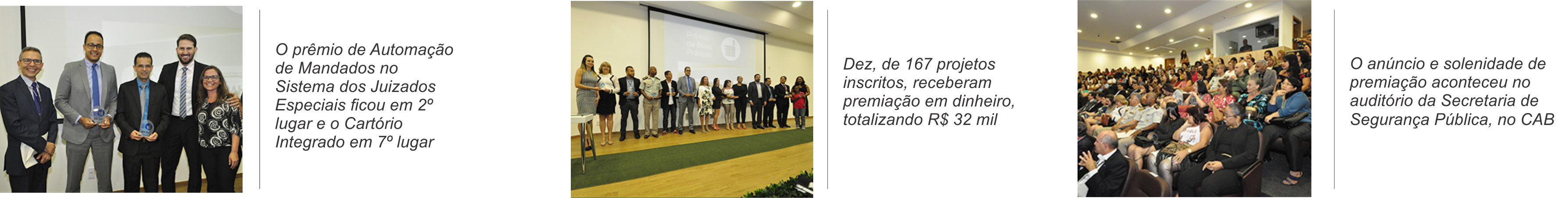 Durante a solenidade, que aconteceu no auditório da Secretaria de Segurança Pública, no CAB, o oficial de justiça Osenar dos Santos Silva – idealizador do projeto de Automação de Mandados – subiu ao palco para buscar o troféu acompanhado pelo diretor de Primeiro Grau, Cícero Moura, e pelo secretário de Planejamento, Igor Caires. O servidor conta que o projeto completou um ano no último mês de setembro, cumprindo sua função com efetividade.