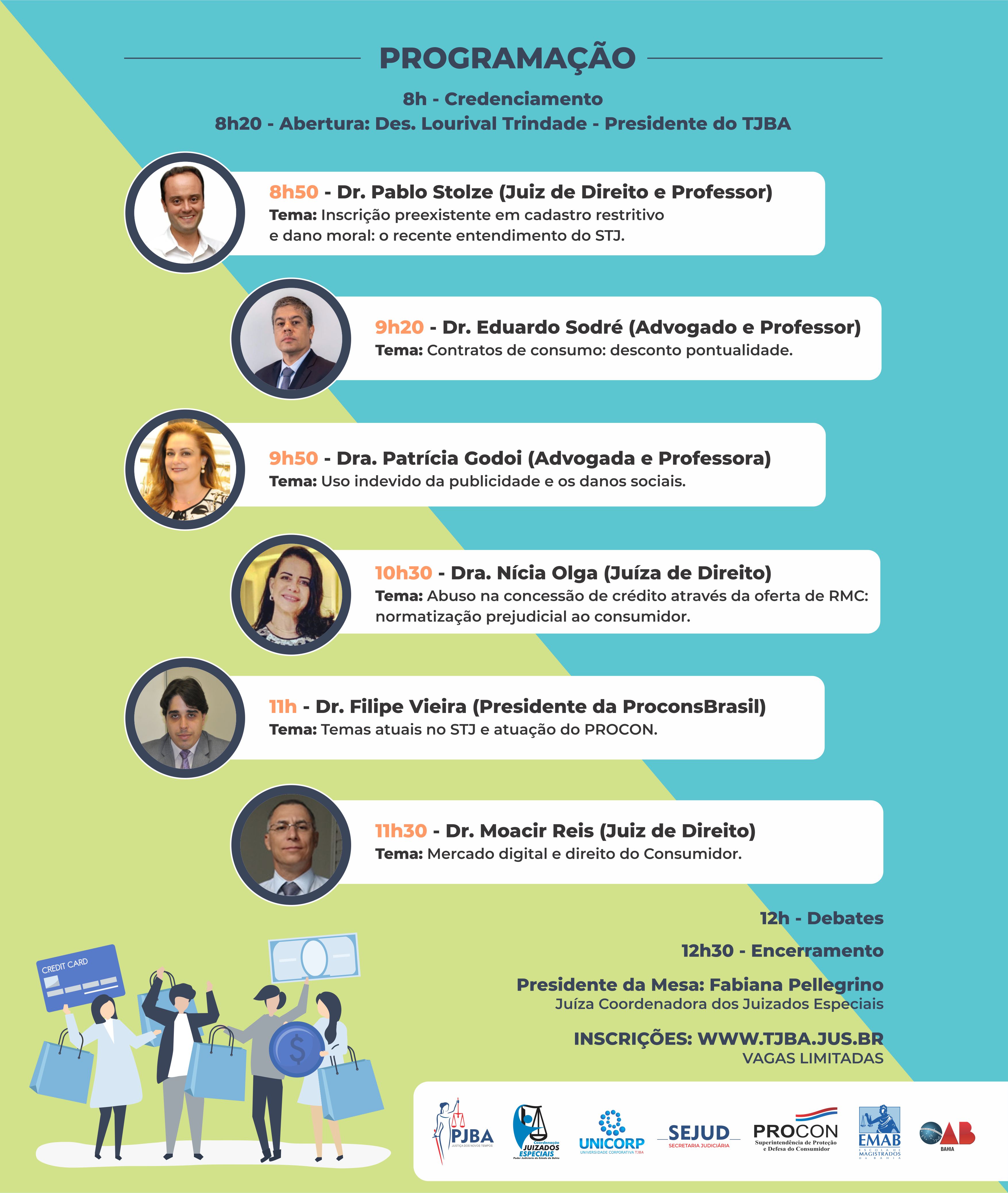 Sendo assim, em 13 de março haverá um grande Ciclo de Palestras sobre diversos assuntos de consumeristas, com importantes juristas, que ocorrerá no Auditório do Fórum Regional do Imbuí (Central dos Juizados).