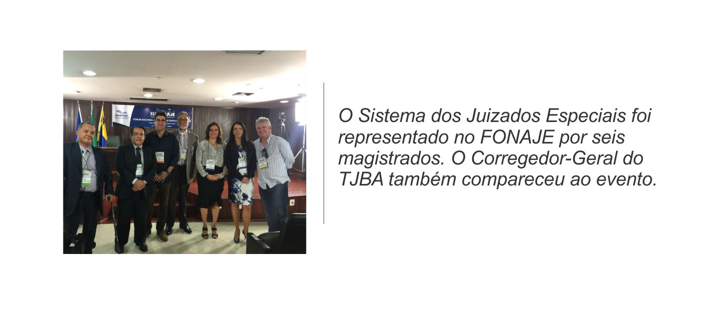 O Tribunal de Justiça do Estado da Bahia está representado no FONAJE pelo Corregedor Geral, Desembargador Osvaldo Bomfim, o juiz coordenador dos Juizados Especiais, Paulo Alberto Nunes Chenaud e os magistrados Rilton Góes Ribeiro, Andréa Tourinho Cerqueira, Cristiane Cunha Fernandes, Josevando Souza de Andrade e Marcelo Silva Britto.