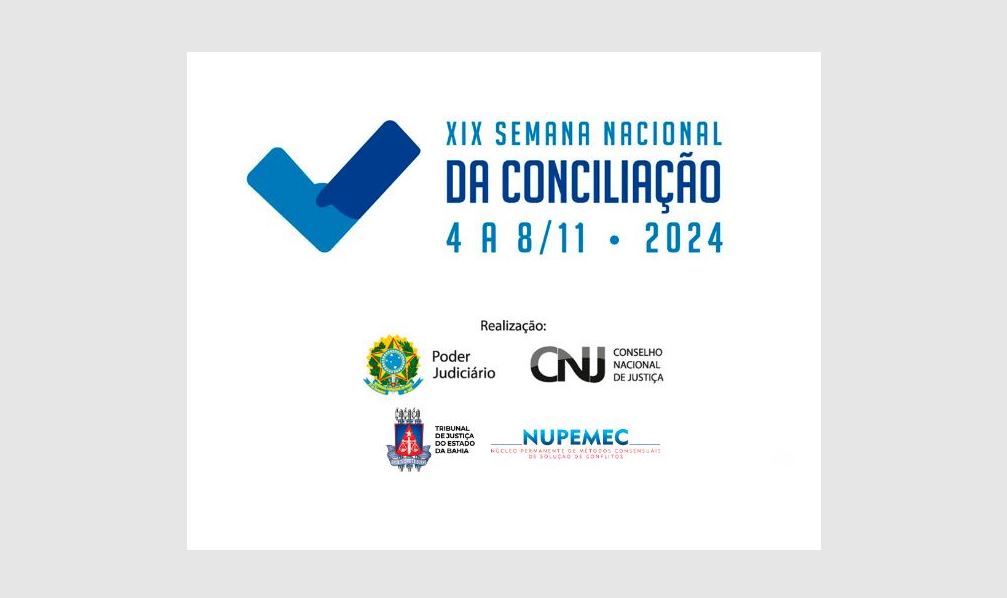 No âmbito do Tribunal de Justiça da Bahia (TJBA), ocorrerá, uma semana antes, de 29 de outubro a 1º de novembro, a Semana Estadual de Conciliação, sendo esta a segunda edição do ano. Para essa ação, não há mais possibilidade de solicitar audiências para processos em curso. No entanto, para questões ainda não judicializadas, os interessados poderão buscar atendimento nas unidades do CEJUSC durante o período.