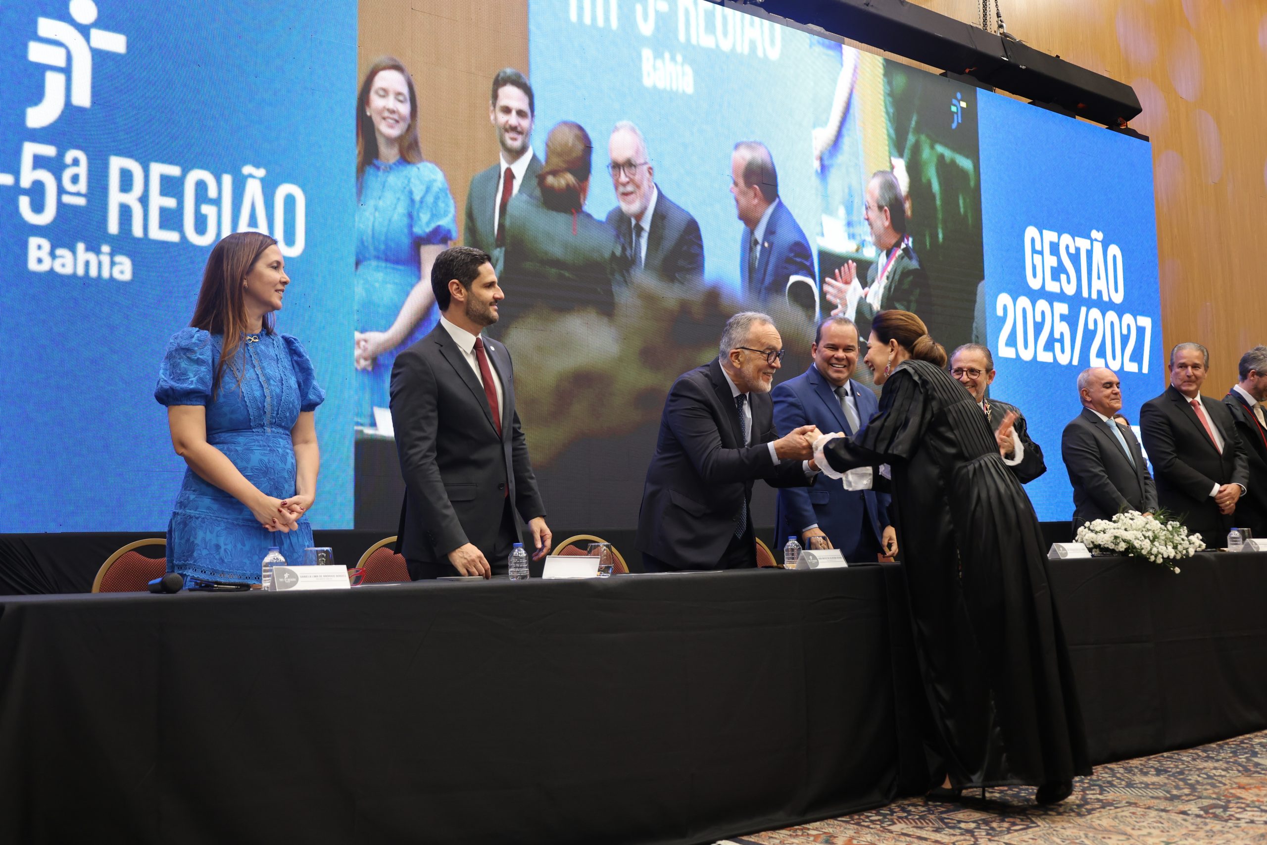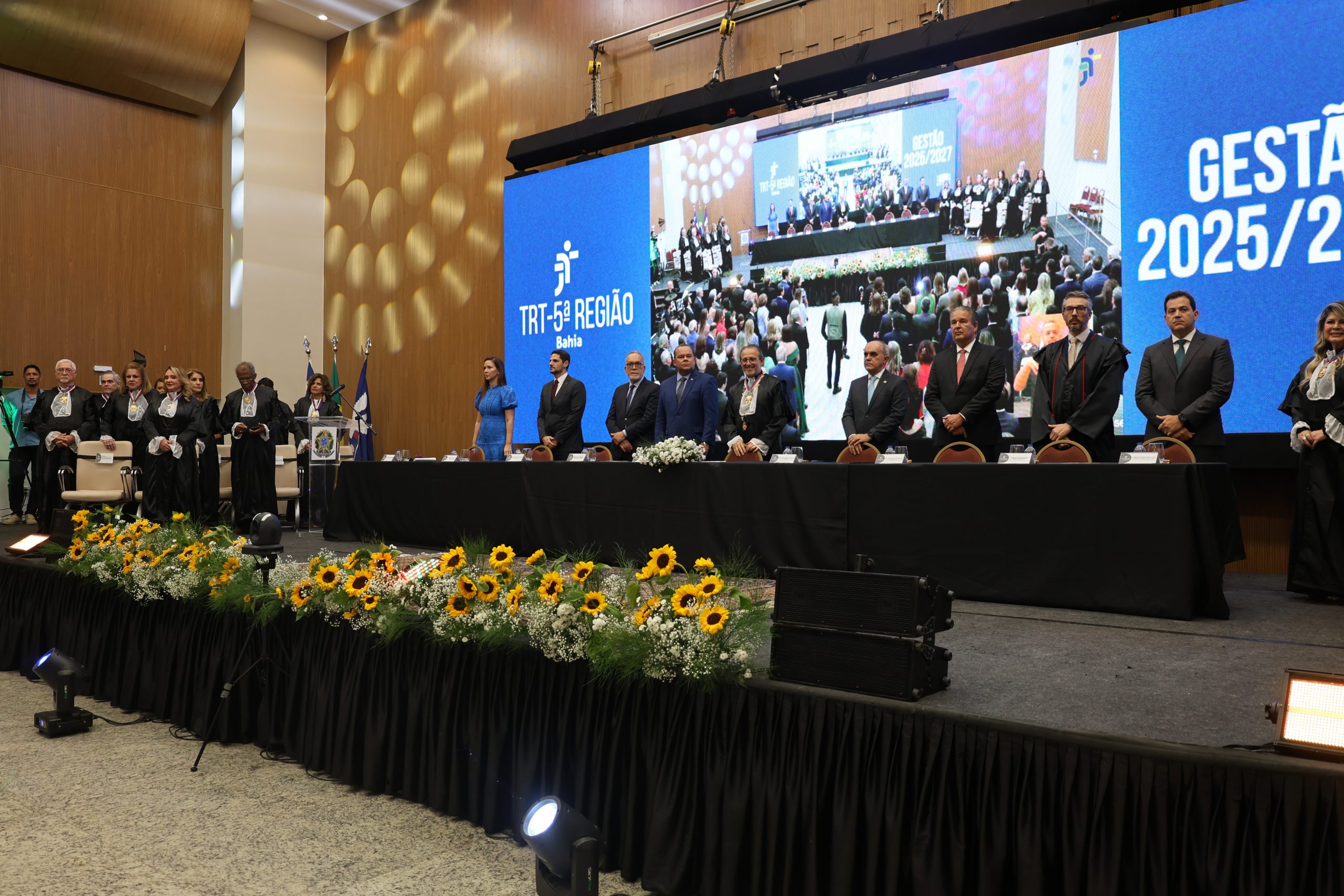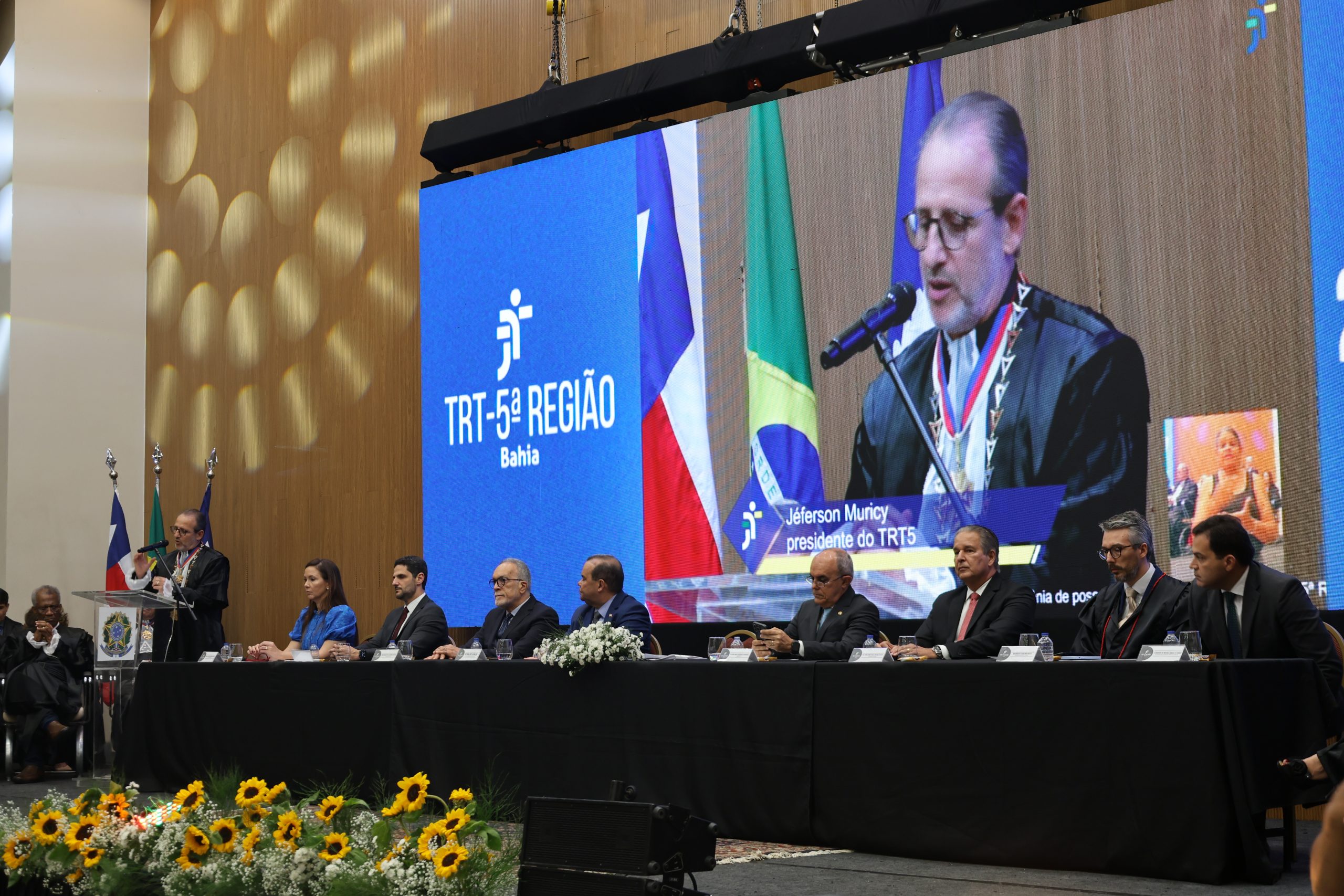 O Desembargador João Bôsco de Oliveira Seixas, 1º Vice-Presidente do Tribunal de Justiça do Estado da Bahia (TJBA), representou a Desembargadora Presidente Cynthia Maria Pina Resende na cerimônia de posse da nova Mesa Diretora do Tribunal Regional do Trabalho da 5ª Região (TRT5) para o biênio 2025-2027.