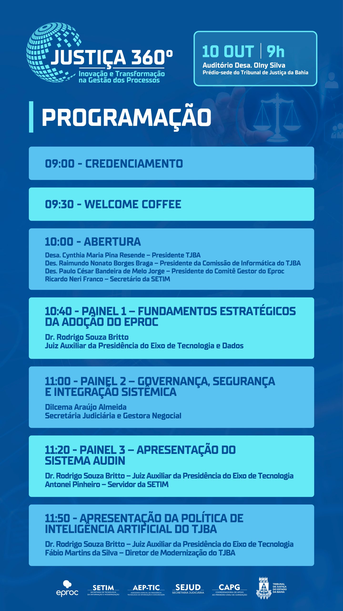 Na sequência, ocorrerão quatro painéis: Fundamentos Estratégicos da Adoção do Eproc; Governança, Segurança e Integração Sistêmica; Apresentação do Sistema AUDIN; e Apresentação da Política de Inteligência Artificial do TJBA.