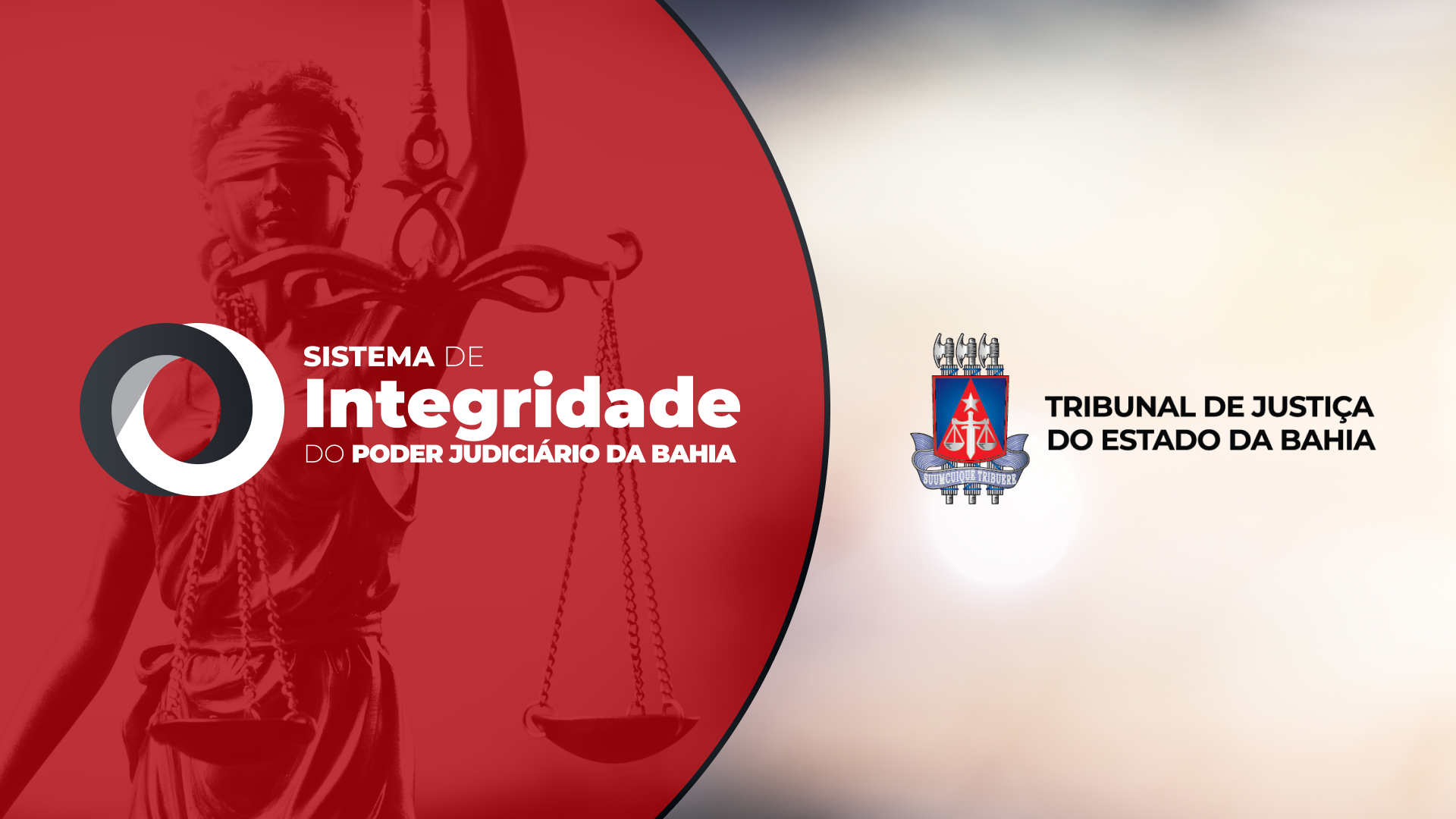 Descrição da imagem: ilustrativa com a divisão de cores entre vermelho e branco, sendo a palavra integridade no fundo de cor vermelha e o Tribunal de Justiça no fundo branco {Fim da descrição}.