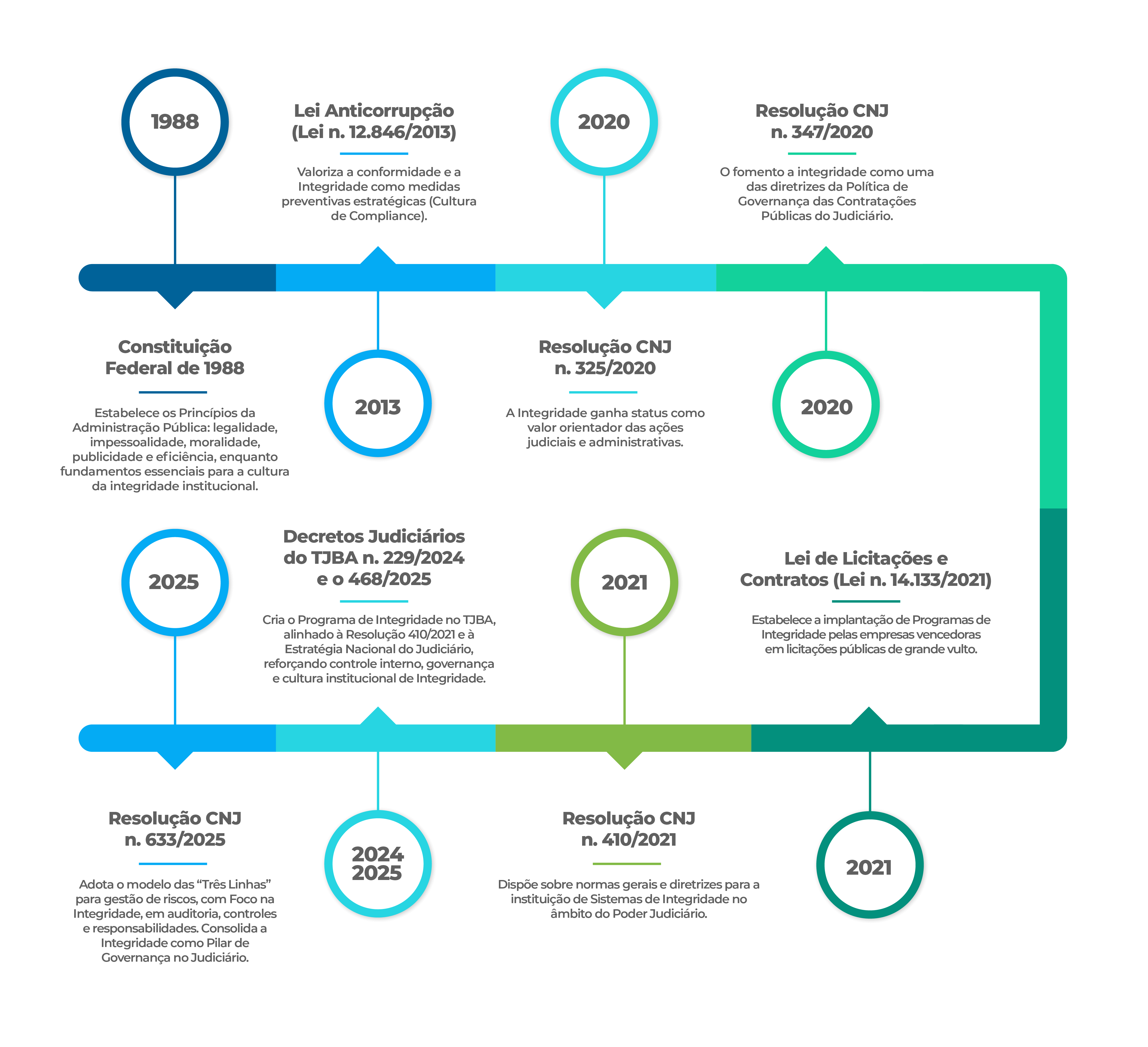 O Sistema de Integridade do PJBA alinha-se também à Resolução CNJ nº 633/2025, que adota o modelo das “Três Linhas” para a gestão de riscos, fortalecendo a integridade em auditoria, controles e responsabilidades, além de consolidar a integridade como pilar da governança no Poder Judiciário.