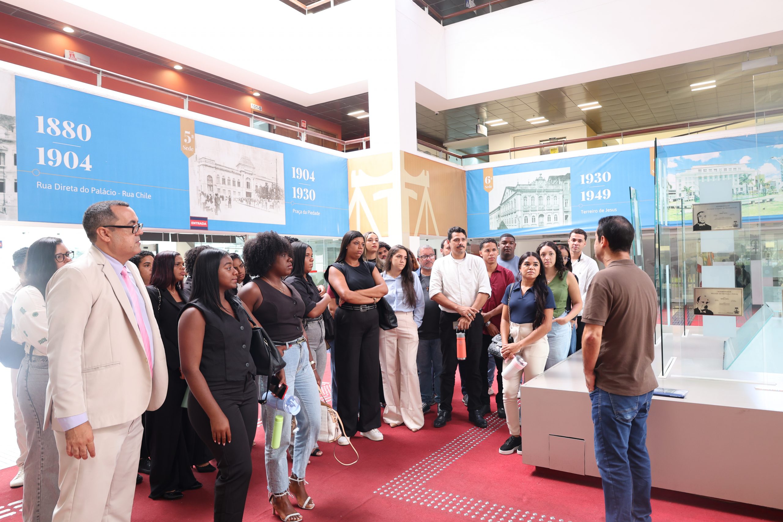 A programação começou na sede do TJBA, onde os estudantes percorreram espaços importantes da Corte e conheceram um pouco mais da estrutura do Tribunal de Justiça. O grupo iniciou o roteiro pelo átrio, área central do edifício e principal ponto de circulação de visitantes e servidores. O espaço reúne elementos arquitetônicos e institucionais que representam a história e a identidade do Judiciário baiano.