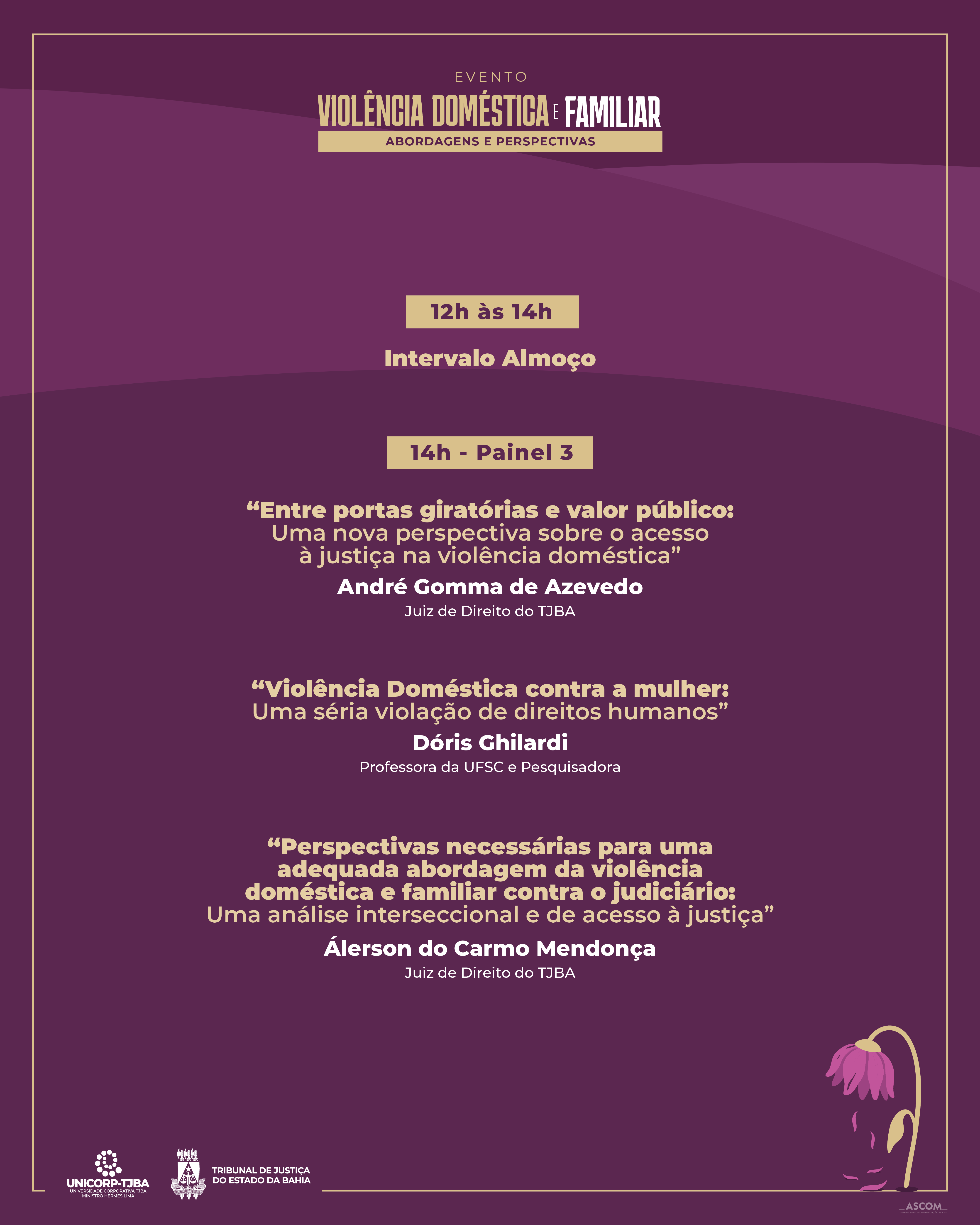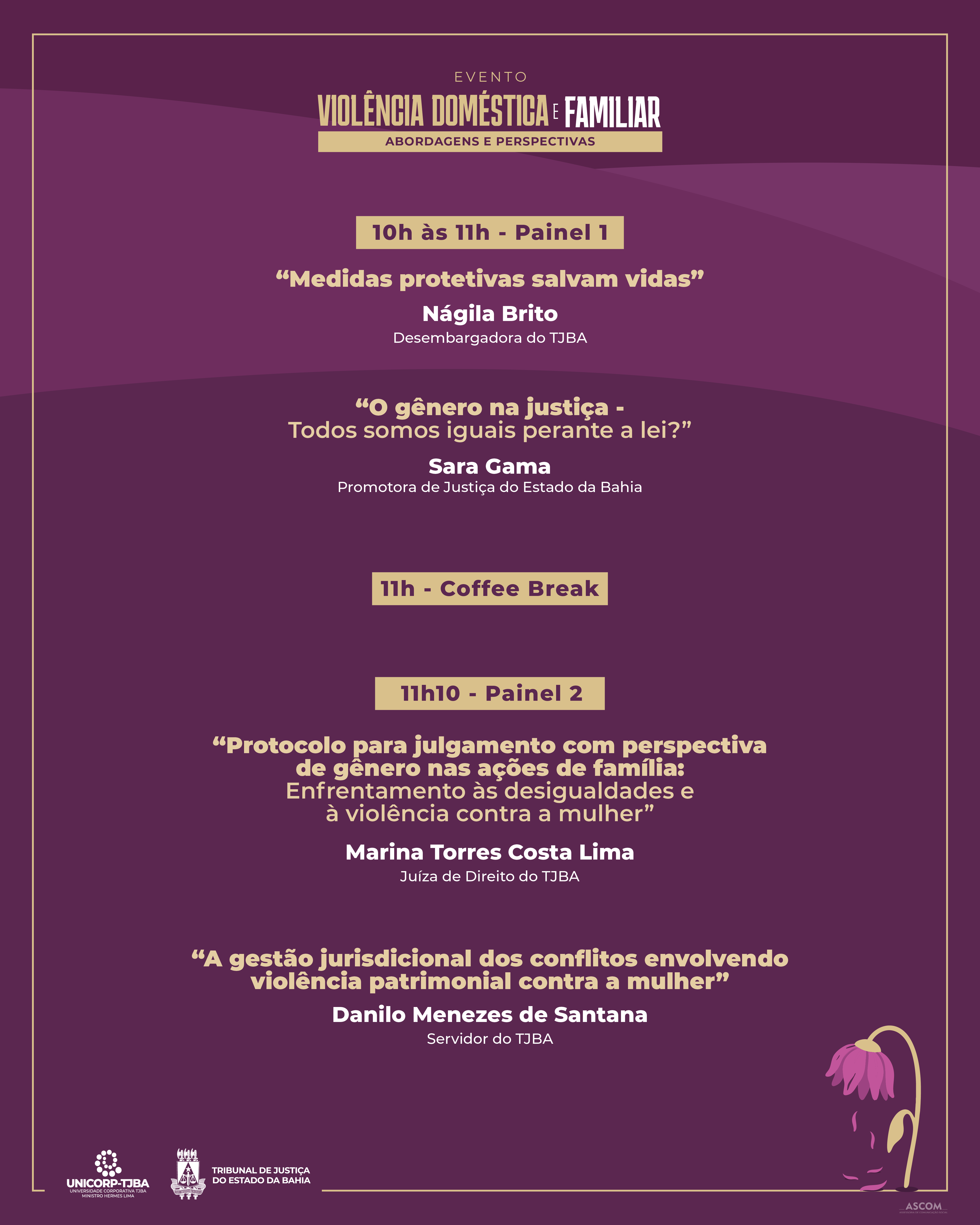 Com o intuito de promover um espaço de debate e reflexão sobre a violência doméstica e familiar, a Universidade Corporativa Ministro Hermes Lima (Unicorp-TJBA) promoverá, no dia 24 de outubro, o evento “Violência Doméstica e Familiar: Abordagens e Perspectivas”, no Auditório Desembargadora Olny Silva.