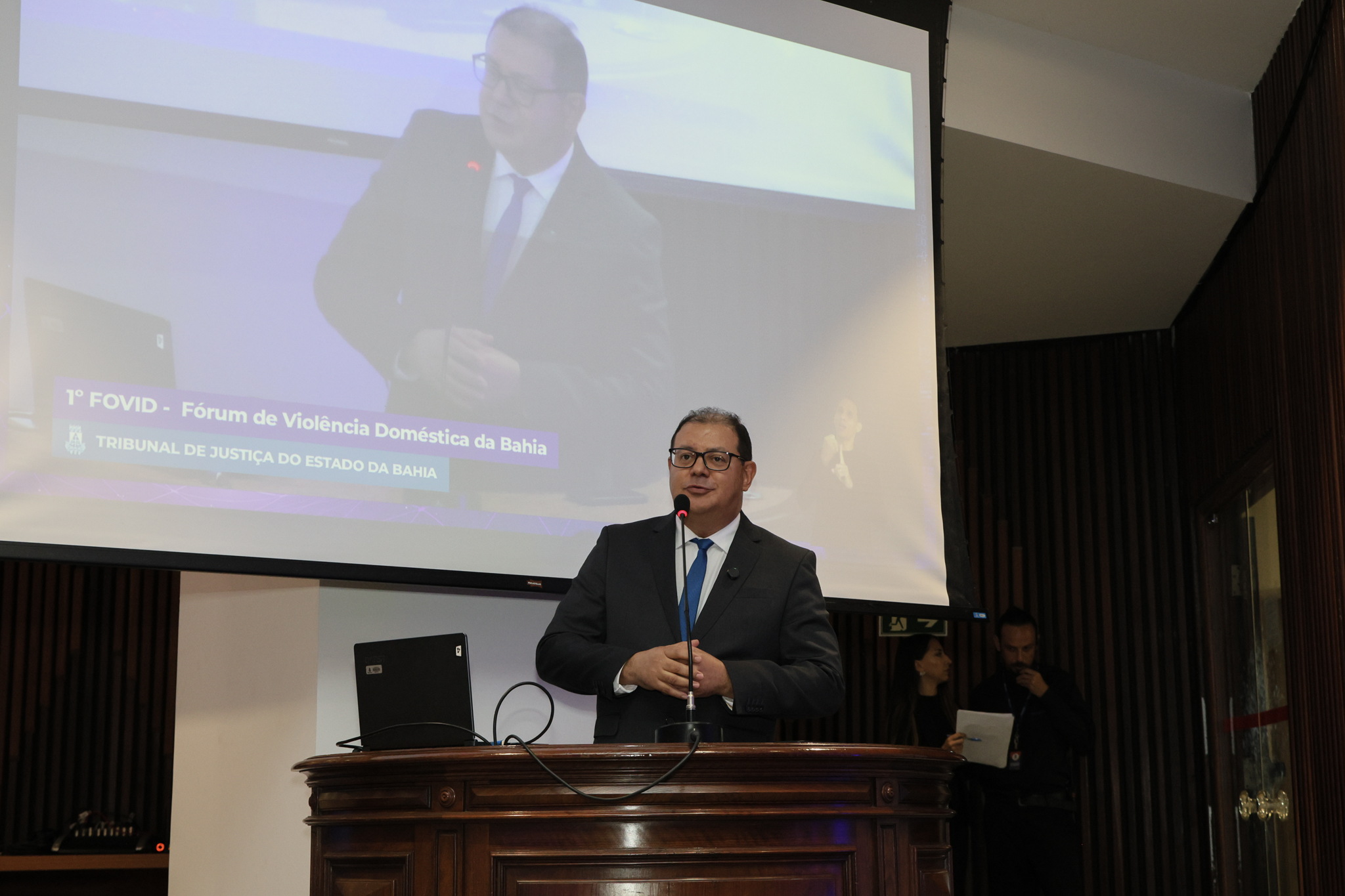 O 2º Vice-Presidente do TJBA, Desembargador Mário Albiani Júnior, representou o Presidente José Rotondano na ocasião. “É de extrema importância o Tribunal voltar seus olhos à questão da violência contra a mulher, que é extremamente vulnerável”, pontuou. Ele destacou que a Presidência está investindo em tecnologia para auxiliar a mulher a obter metida protetiva de urgência de uma forma mais fácil e rápida, por meio de um aplicativo com previsão de lançamento nas próximas semanas.