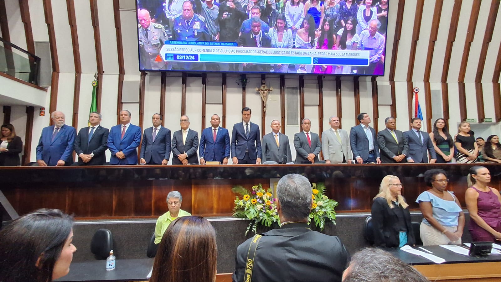 Na manhã de ontem, 02/12/2024, o Desembargador João Bôsco de Oliveira Seixas, presidente em Exercício do TJ-Ba, participou da solenidade de entrega da Comenda 2 julho ao Procurador-geral de Justiça da Bahia, Pedro Maia. A sessão Especial ocorreu no plenário Deputado Luís Eduardo Magalhães, no Centro Administrativo da Bahia.