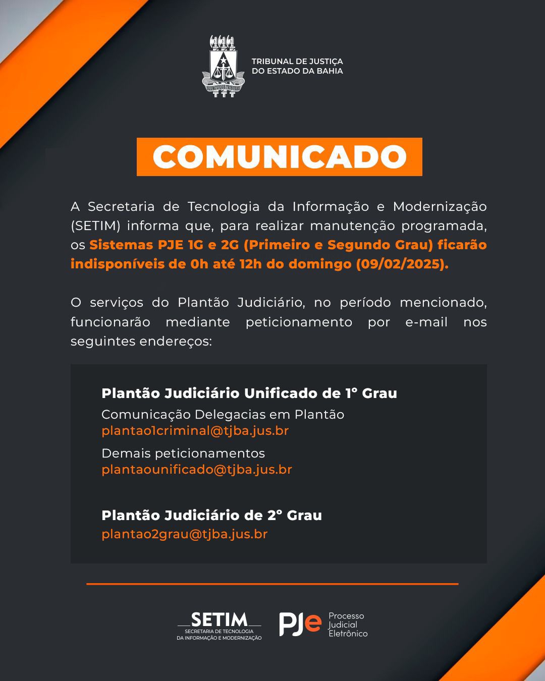 Conforme informado pela Secretaria de Tecnologia da Informação e Modernização – SETIM, os Sistemas PJE do 1º e 2º Graus estarão indisponíveis das 00h às 12h do dia 09 de fevereiro, em virtude de manutenção.
