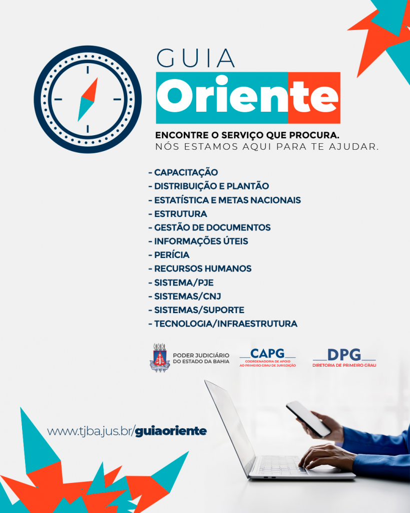 O Guia é uma ferramenta on-line voltada a auxiliar servidores, magistrados e cidadãos, com demandas do Judiciário. Para encontrá-lo no site oficial do TJBA, basta ir ao topo da página, clicar na aba “Portais do PJBA” e, em seguida, selecionar “Primeiro Grau”. Você será redirecionado ao Portal do Primeiro Grau, onde na página principal, à esquerda, está disposto o ícone do “Guia Oriente”, ou digite tjba.jus.br/guiaoriente.