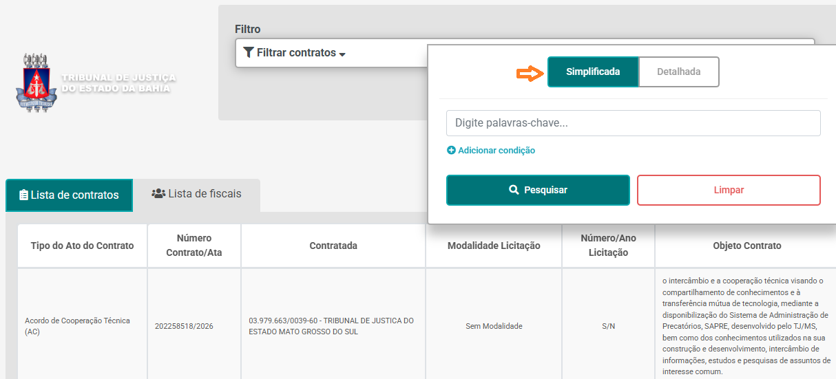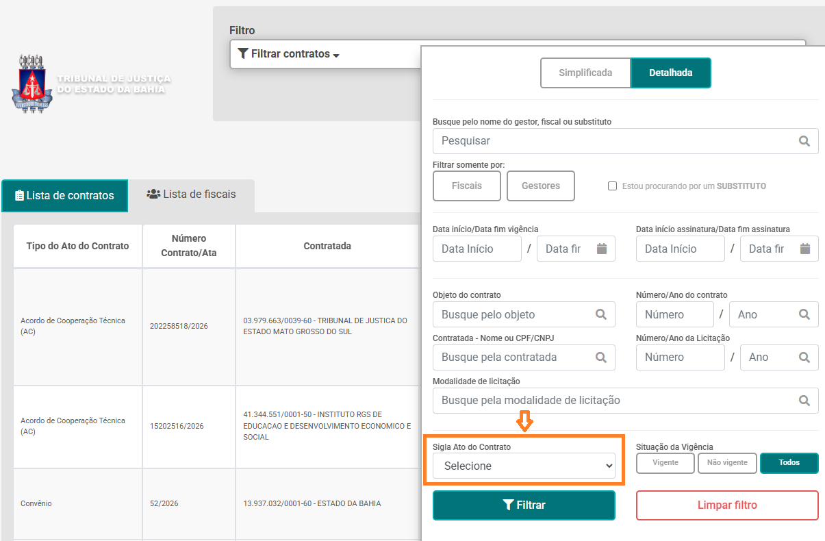 No filtro, na opção de busca Detalhada, selecione “Sigla Ato do Contrato” e escolha a opção desejada, como Acordo de Cooperação Técnica, Convênios, entre outros. Para realizar a pesquisa através de palavras-chave, utilize a opção de busca Simplificada. Veja nos exemplos abaixo: